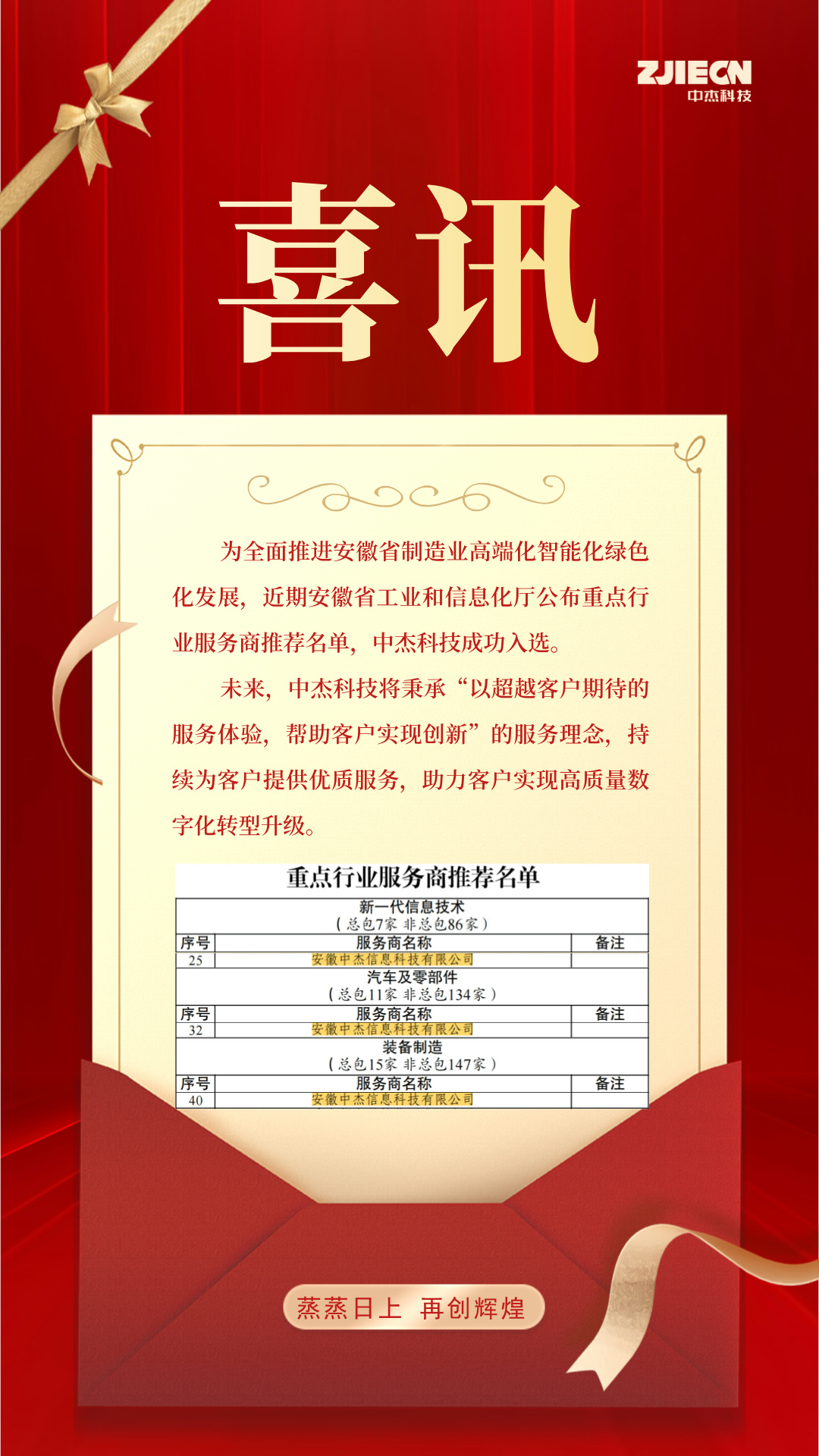 喜讯 | 中杰科技成功入选安徽省制造业重点行业服务商推荐名单