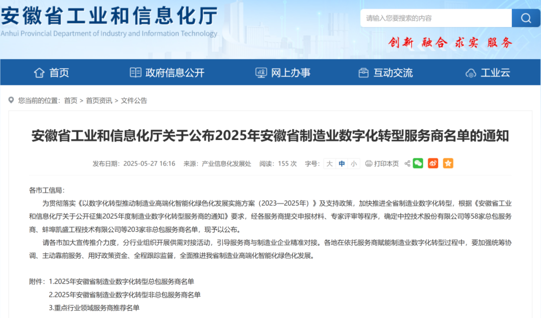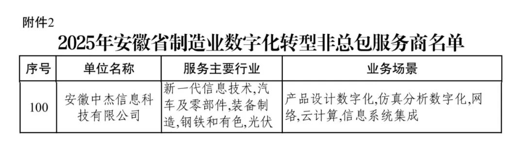 为贯彻落实《以数字化转型推动制造业高端化智能化绿色化发展实施方案(2023—2025年)》,深化制造业数字化转型服务生态建设,安徽省经济和信息化厅近日公布2025年安徽省制造业数字化转型服务商资源池名单。中杰科技凭借卓越的技术实力、成熟的行业解决方案及持续创新能力,再次成功入选安徽省制造业数字化转型服务商。